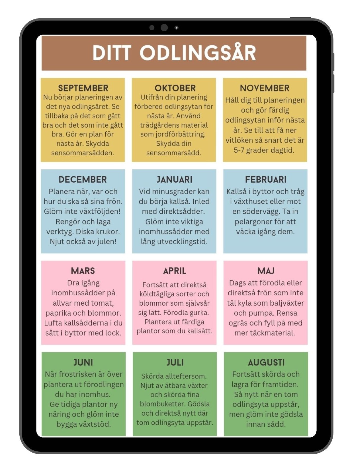 Den hjälper dig att strukturera upp din odling månad för månad – så du slipper känna dig överväldigad av allt som ska göras, och istället kan njuta av att se din trädgård växa i takt med dig.